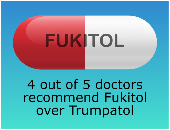 Tags: attitude, depression, drug, medication, psychiatry, state of mind, psychology, politics, political satire, humor, parody, fukitol, fukitol pill, 4 out of 5 doctors recommended, fukitol over trumpalot