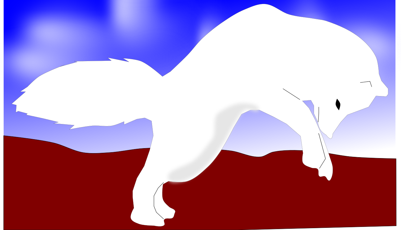 This features a white wolf walking across a red background. It appears to be in motion, possibly running or leaping through the air. The wolf's body is stretched out as it moves, giving an impression of speed and agility. The scene captures the essence of wildlife and nature, with the wolf being the central focus of the image.