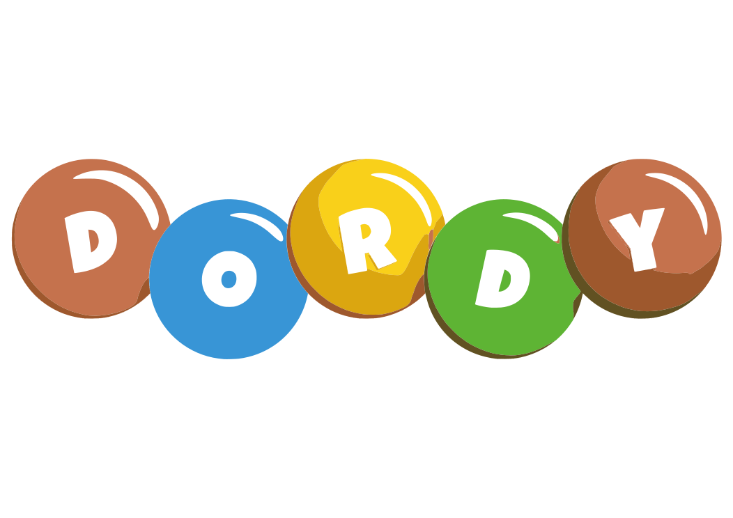 This features a series of illustrations that spell out the word "Dordy." Each letter is represented by a different colored candy, creating an eye-catching and playful display. There are five distinct candies in total, each with its own unique color: blue, yellow, green, orange, and brown. The arrangement of these candies forms the word "Dordy," making it a fun and creative way to represent the name.