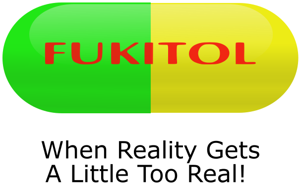 This is a green and yellow pill bottle with the word "Fukitol" written on it. The text is in white, making it stand out against the background. The pill bottle appears to be a playful or satirical take on reality, as indicated by the phrase "When Reality Gets A Little Too Real!" printed below the word Fukitol. This suggests that the image might be poking fun at the idea of taking pills for everyday issues and exaggerating their effects to create a humorous or sarcastic message.