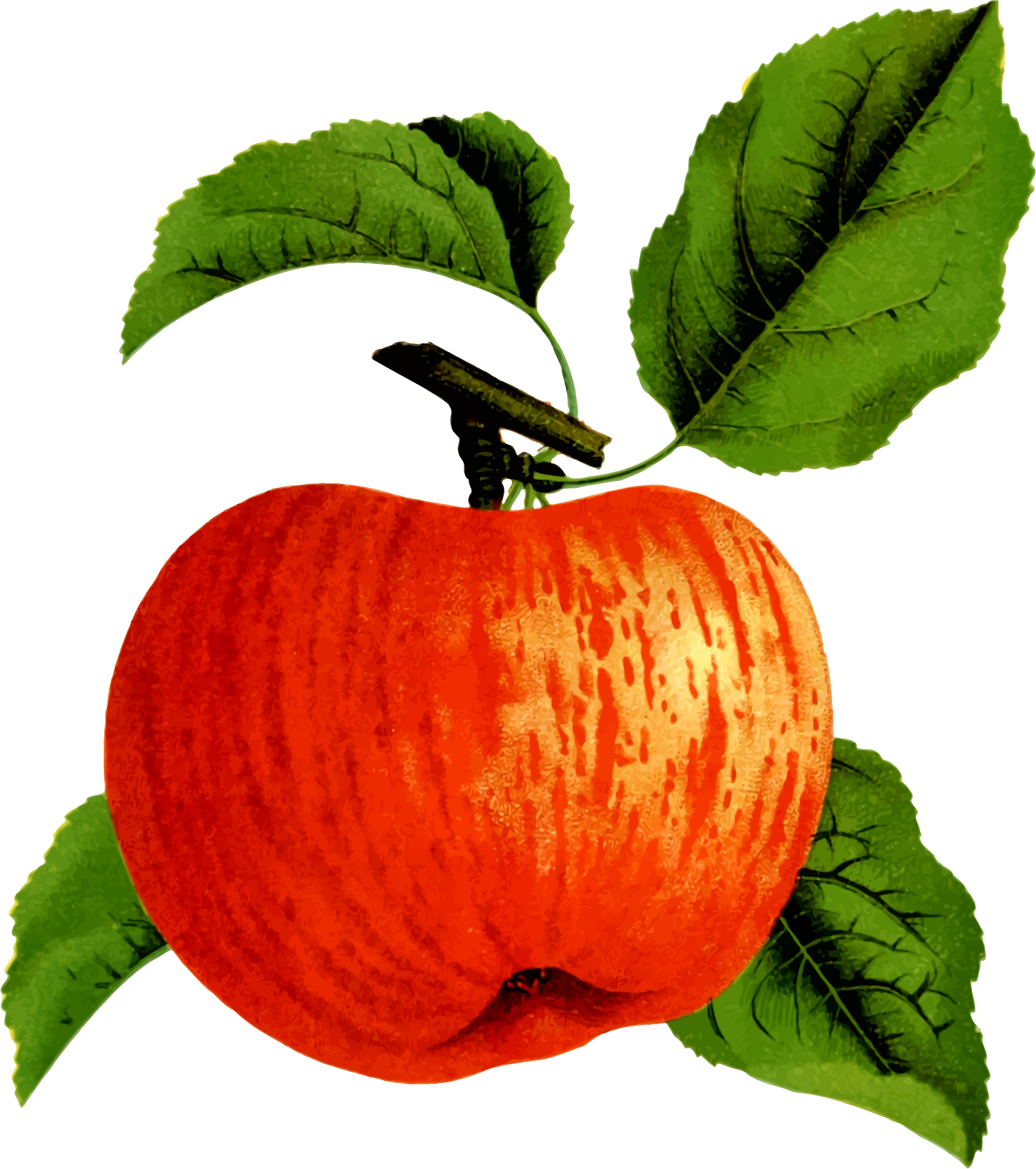 This features a large, ripe red apple with a green stem. It is prominently displayed in the center of the picture and appears to be the main focus of the scene. The apple has a slightly speckled surface, adding texture and depth to its appearance. In addition to the apple, there are two leaves visible in the background, one on the left side and another towards the right. These leaves provide context for the natural setting where the apple is growing or being displayed.