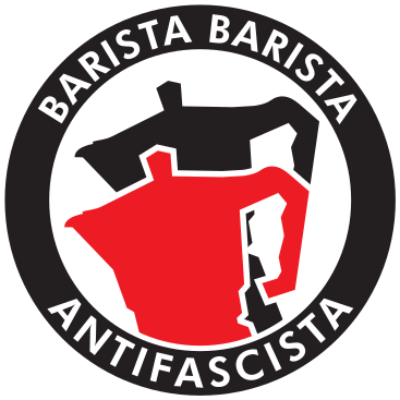 This features a red and white coffee pot with the words "Barista, Barista, Antifascista" written on it. This logo is inspired by an amusing statement made at a court hearing where a policeman claimed to have heard an antifascist chant involving the phrase "Barista, Barista, Antifascista." The coffee pot's design and message convey a sense of humor and defiance against fascism.