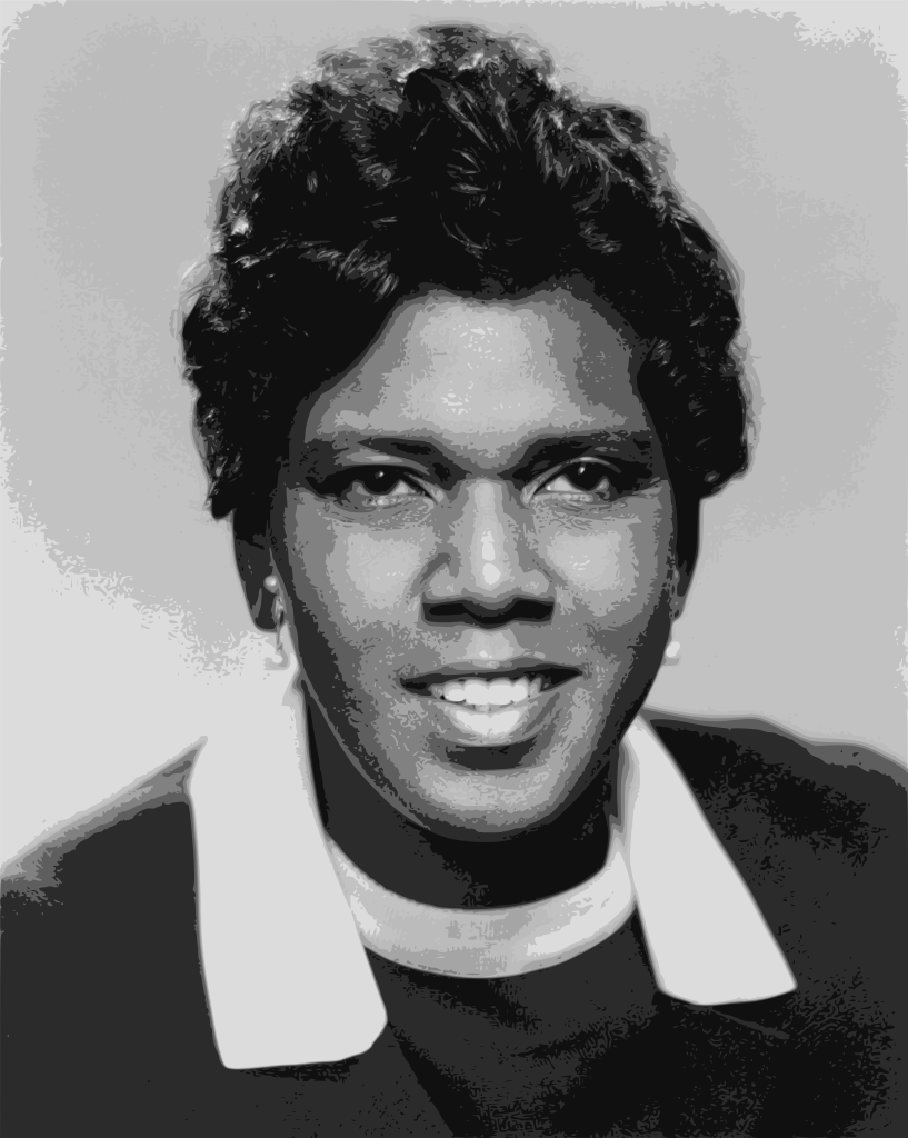 This features a woman with short hair, wearing a black and white shirt. She is smiling for the camera, giving off a warm and friendly vibe. Her attire suggests that she might be dressed up for an event or occasion. The photo appears to be in black and white, adding a classic touch to the image.