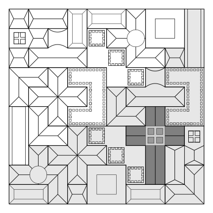 This is a large, intricate puzzle made up of various shapes and designs. These shapes include squares, diamonds, circles, and other geometric patterns. The puzzle appears to be a complex design with many different pieces that fit together to form the larger picture. The colors used in this puzzle are predominantly shades of gray, giving it an elegant and sophisticated appearance. Overall, the image showcases a well-crafted and visually appealing puzzle that would likely challenge and engage anyone who attempts to solve it.