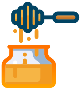 This features a jar filled with honey, and it is being poured into the jar using a honey dipper. The honey dipper has a spoon on top of it, which is used to scoop the honey from the container. The honey appears to be dripping down the side of the jar as it is being poured in. This illustration captures a common kitchen scene where someone might use a honey dipper to serve honey onto their food or into a bowl for consumption.