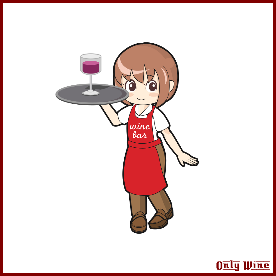 This features a cartoon character holding a tray with a wine glass on it. The character is wearing an apron and appears to be serving the wine. The scene takes place in front of a backdrop that has a bottle of wine on it, adding to the overall theme of the image.