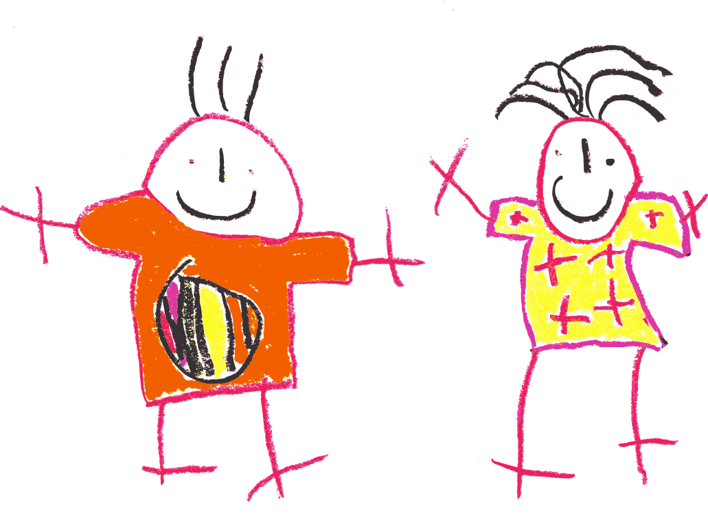 This features two cartoon characters, one wearing a red shirt and the other in yellow. They are both smiling and holding their arms out to each other, creating an impression of friendship or connection between them. The characters appear to be drawn with a pencil on paper, giving them a hand-drawn feel. The scene is likely meant to evoke feelings of warmth and companionship through the use of these two colorful figures.