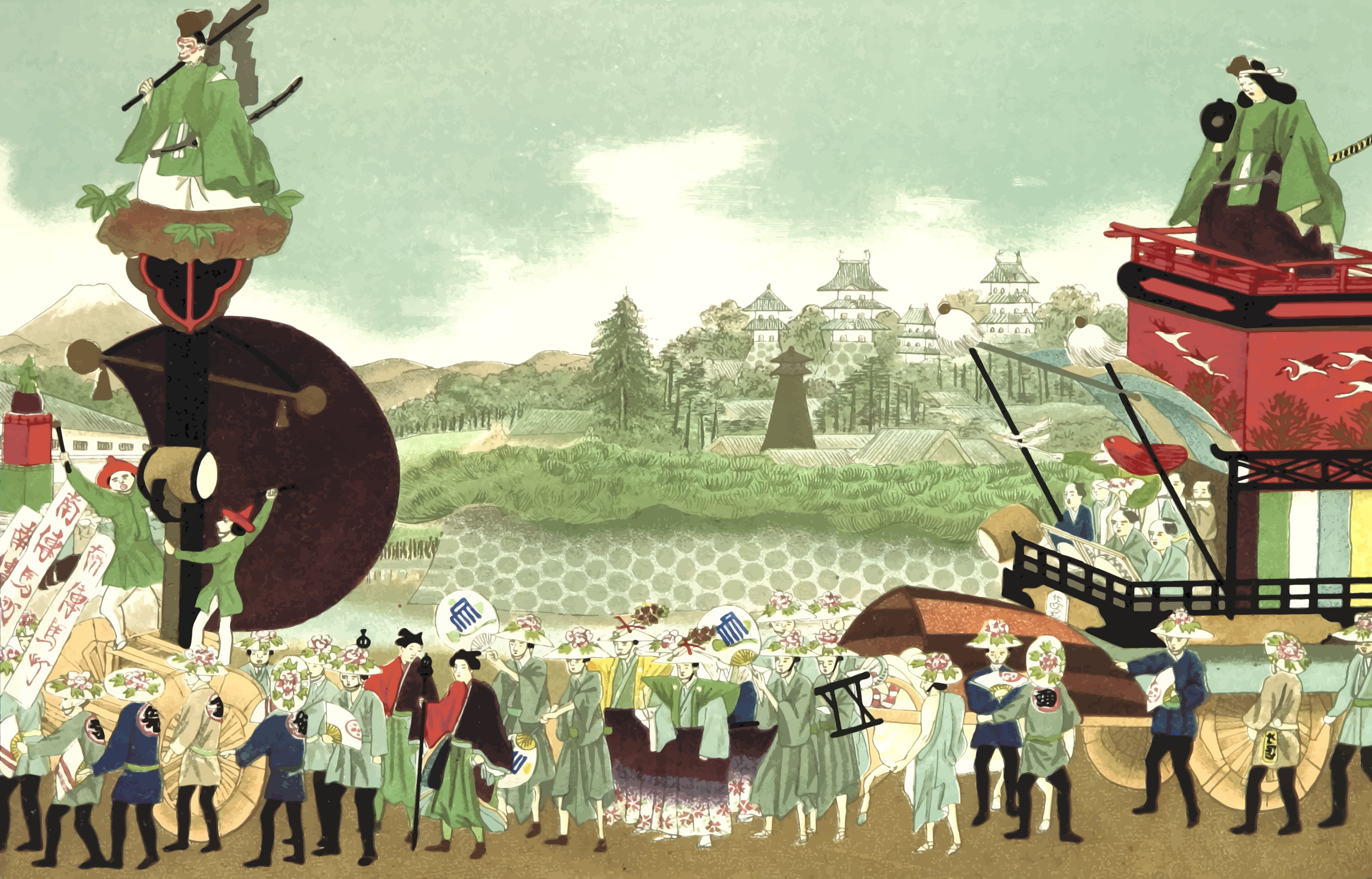 Tags: art, illustration, asian, japanese, cartoon, person, crowd, boat, carriage, painted, water, mountain