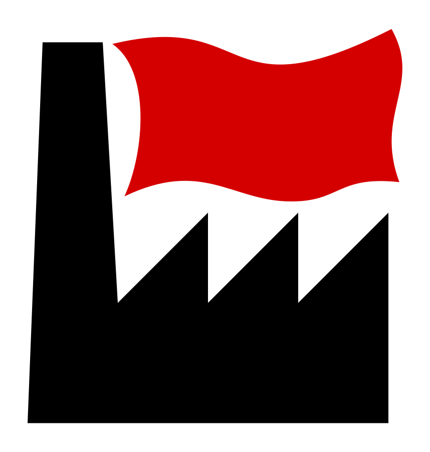This features a red flag with white trim, flying in front of a large building. The building appears to be an industrial facility or factory, as it is surrounded by several cranes and other machinery. There are at least five cranes visible in the scene, some closer to the building while others are further away. Additionally, there are two trucks parked near the building, possibly for transportation purposes. The combination of the red flag, industrial setting, and various vehicles create a dynamic and bustling atmosphere in this image.