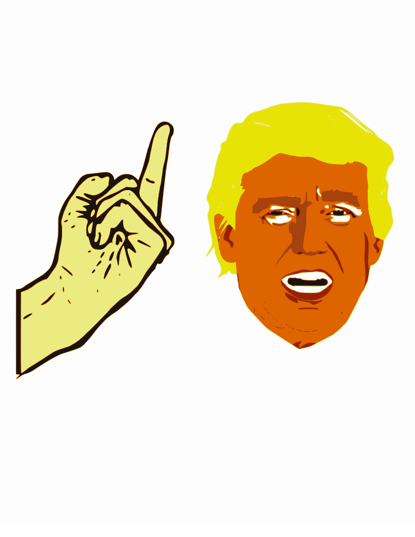 This features a cartoon drawing of Donald Trump, the former President of the United States. He is pointing his finger upwards with an angry expression on his face. The drawing appears to be in yellow and orange tones, giving it a bold and attention-grabbing appearance. The overall composition of the image creates a sense of urgency or importance, as if Trump is making a crucial point or statement.