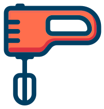 This features a cartoon-like representation of an orange and red hand mixer, which is commonly used for baking and cooking. It has a metal mixing blade attached to it, making it a versatile tool in the kitchen. The mixer's design gives it a unique appearance compared to real-life appliances, adding a touch of whimsy to the image.