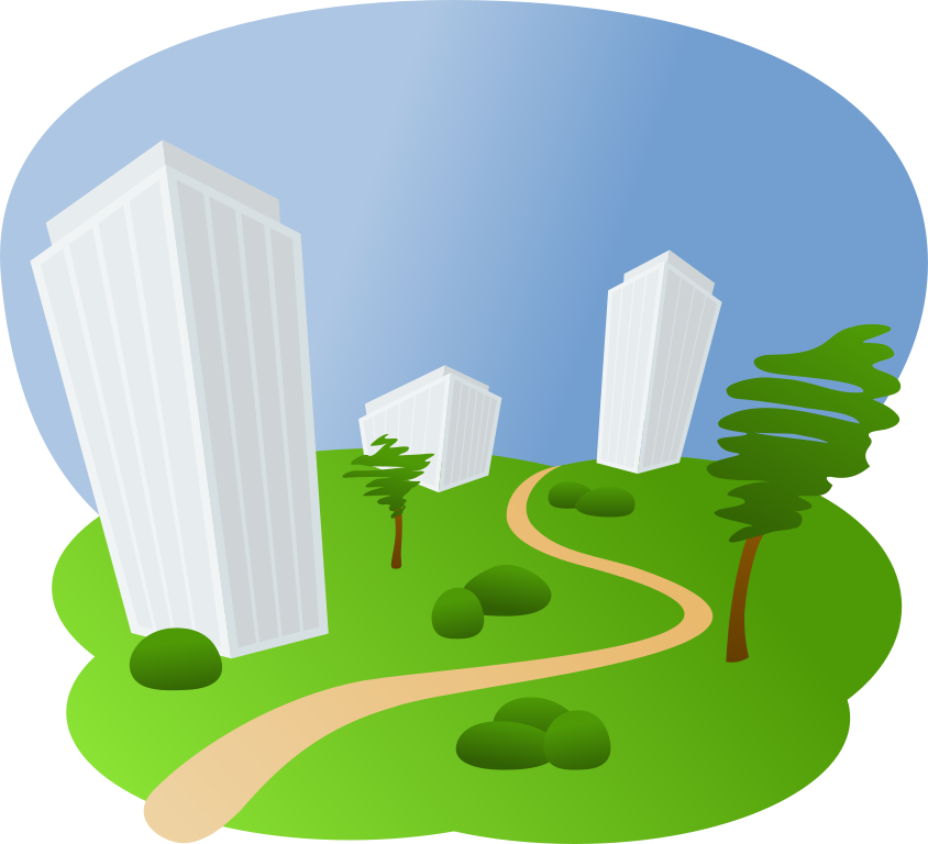 This features a cartoon-like illustration of a city with three tall buildings situated along a dirt path. The path is surrounded by several green bushes and trees, creating a lush and vibrant atmosphere. The scene appears to be set in a park or an open area within the city, providing a pleasant contrast between urban architecture and nature. The overall composition of the image gives off a sense of tranquility and harmony between the built environment and the natural world.