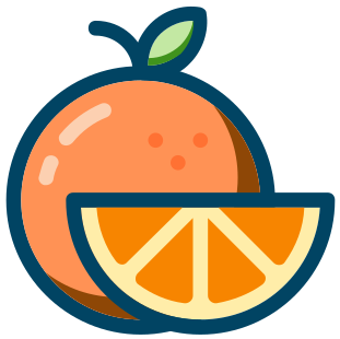 This features a cartoon orange with an orange slice in front of it. The orange has a blue stem and green leaf on its top, giving it a unique appearance. The illustration is colorful and eye-catching, making it an appealing visual representation of the fruit.