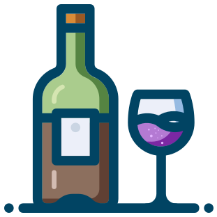 This features a bottle of wine and a glass of wine placed next to each other. The bottle is positioned on the left side, while the glass is located on the right. Both items are depicted in a cartoon-like style with vibrant colors. The wine appears to be purple, adding a touch of elegance to the scene. This illustration could represent a social gathering or a relaxing moment at home, where people enjoy each other's company while sipping on their favorite drink.