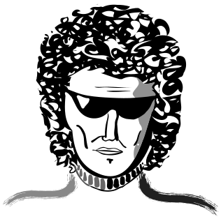 This features a black and white drawing of a man with sunglasses on his head. He has long hair, giving him a distinctive appearance. The man's face is prominently displayed in the foreground, while the rest of his body is obscured by the frame. The drawing appears to be an artistic representation or silhouette of the individual, emphasizing his unique features and style.