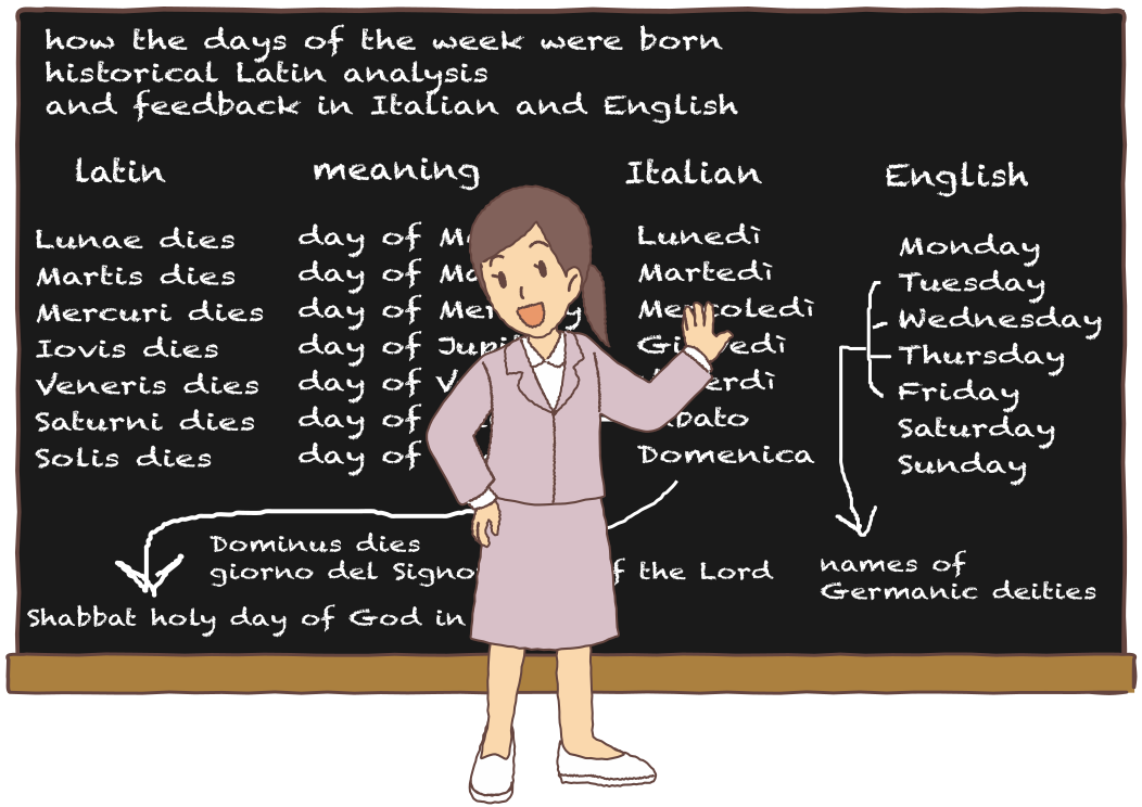This features a woman standing in front of a chalkboard, which is filled with various information. She appears to be teaching or explaining something related to the content on the board. The woman is wearing a pink shirt and skirt, giving her an elegant appearance. She is pointing at different parts of the board while talking, engaging with her audience. The chalkboard contains several words and phrases, including "Italian," "English," "Latin," "Meaning," "Italian," "English," "Lunar," "Martyr," "Mercury," "Venus," "Mars," "Jupiter," "Saturn," "Sunday," and "Shabbat." These words are likely related to the topic being discussed by the woman. The chalkboard serves as a visual aid for her teaching, making it easier for the audience to follow along with her explanation.