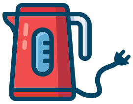 This features a red electric kettle with a handle, which is connected to an electrical cord. The kettle has a see through glass in the middle and is outlined in dark blue. It appears to be a cartoon or comic style drawing of a kettle, giving it a playful appearance. The image captures the essence of a typical electric kettle used for heating water, but with a creative twist through its coloring and presentation.