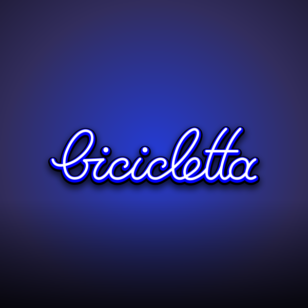 This features a dark blue background with the word "bicicletta" written in cursive. Bicicletta is an Italian word that means bicycle, and it is displayed prominently on the screen. The word stands out against the black backdrop, making it easy to read and understand. This illustration could be used for various purposes such as advertising a bike shop or promoting cycling events.