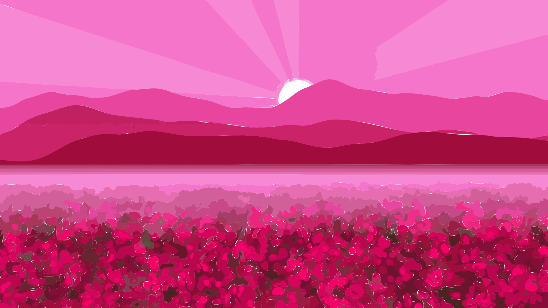 This features a beautiful landscape with a pink sunset in the background. The sky is filled with warm hues, creating an idyllic atmosphere. In front of the mountains, there are fields of pink flowers that add to the vibrant scene. The combination of the pink flowers and the silhouettes of the mountain range creates a picturesque view that captures the essence of nature's beauty.