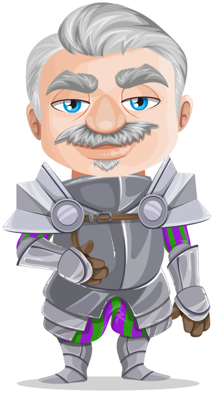 This features a cartoon illustration of an old man wearing a suit of armor. He is standing with his hands on his hips, giving off a confident and powerful vibe. His facial expression shows a smile, indicating that he is happy or content in the moment. The armor itself is gray, matching the overall color scheme of the illustration. This unique combination of an old man dressed as a knight creates a whimsical and imaginative scene.