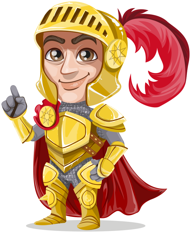 This features a cartoon character dressed in medieval armor, complete with a golden helmet and red feather. The character is wearing a cape and holding up his finger, giving the impression of being playful or confident. The color scheme of the armor consists of gold and red, adding to the overall visual appeal of the character. This illustration could be used for various purposes such as advertising, children's books, or video games that involve fantasy elements.