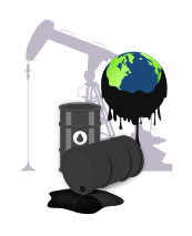 This features a globe of Earth with an oil rig in the background. Above the globe, there is a large oil can leaking black substance onto the ground. Another smaller oil can is also present on the scene, adding to the overall theme of pollution and environmental concerns. The image effectively conveys the negative impact that human activities have on our planet's ecosystems.