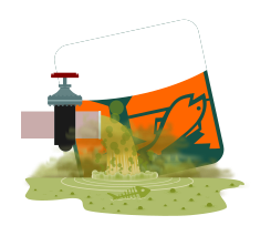 This features a dirty water pipe with green and smoky water coming out of it. A fish is positioned near the water, appearing to be affected by the pollution in the area. This scene highlights the negative impact that pollution can have on aquatic life and the environment as a whole.