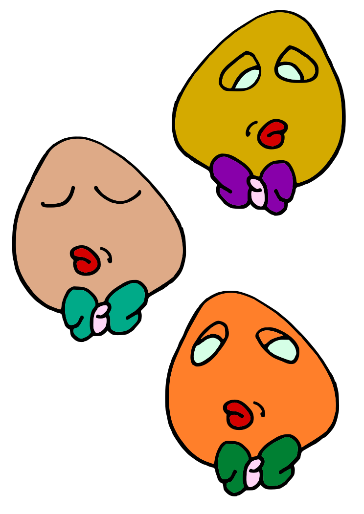 This features a set of four cartoon-like vegetable characters, each with different colors and expressions. Two of the characters are orange, one is yellow, and another is brown. They all have eyes, mouths, and noses drawn on them, giving them a unique personality. The first character on the left is an orange carrot with a purple bow tie around its neck. The second character in the middle is also an orange carrot, but it has a green bow tie instead of purple. The third character on the right is a yellow banana, and the fourth character at the bottom is a brown potato. Each character appears to be singing or making a funny face, adding a playful element to the image.