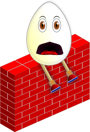 This features a cartoon egg sitting on top of a red brick wall. The egg appears to be surprised, with its mouth open and eyes wide in shock. It is positioned towards the center of the wall, giving it a prominent spot. The wall itself is made up of several bricks, creating a sturdy structure for the egg to sit upon. This whimsical scene captures the playful nature of the egg character as it interacts with its surroundings in an unexpected way.