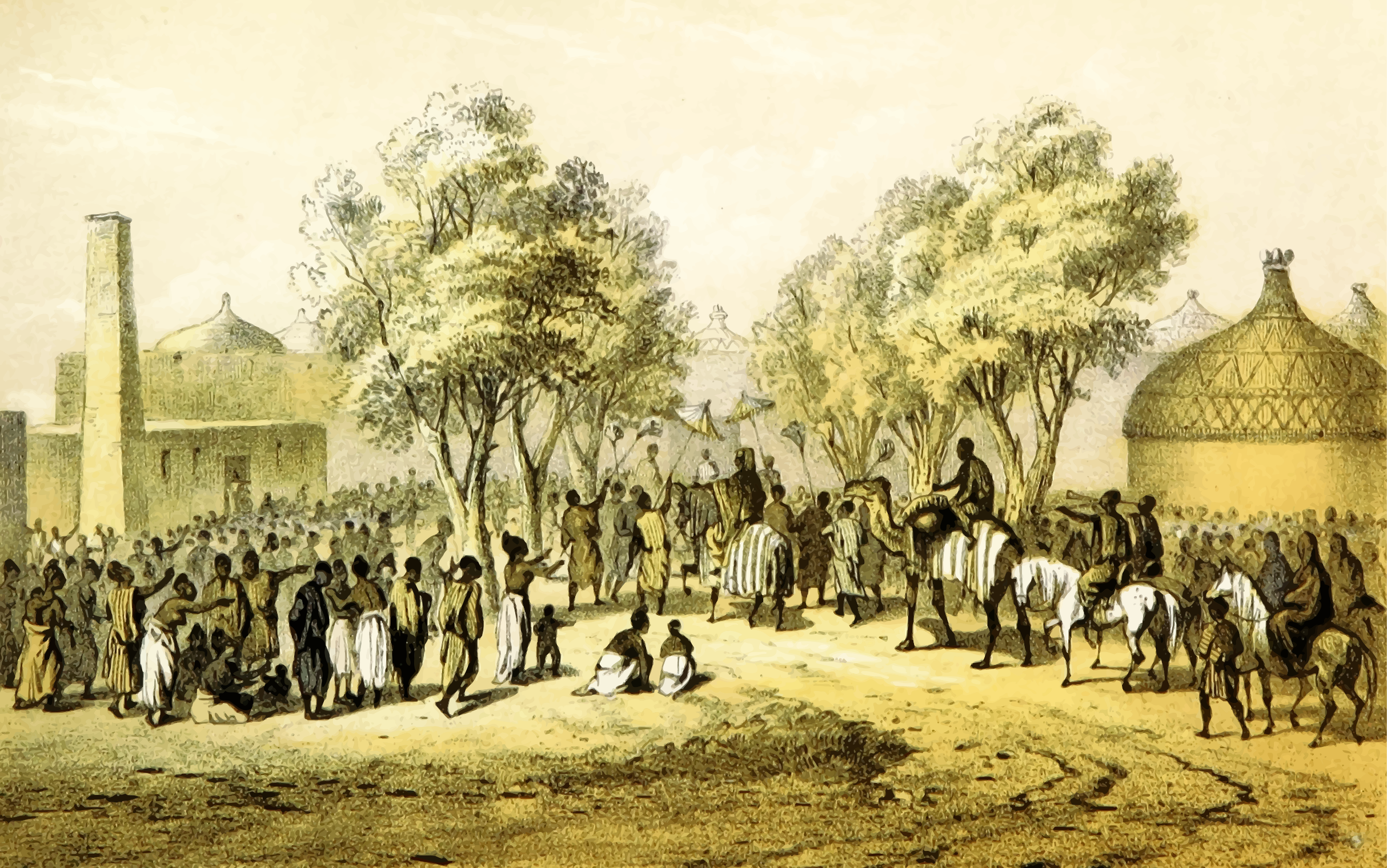 This depicts a large group of people gathered in an open area, possibly a village or town square. There are at least 14 individuals visible in the scene, with some standing and others sitting on the ground. They appear to be engaged in conversation or simply enjoying each other's company. In addition to the people, there is a horse prominently featured in the image, located towards the right side of the scene. The horse seems to be the center of attention for some of the individuals present. Overall, it appears to be a lively gathering with various activities taking place.