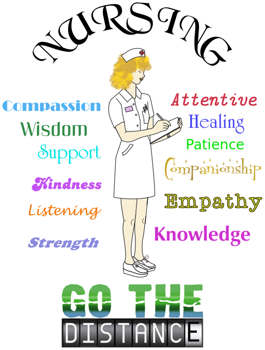This features a nurse in her uniform, standing and writing something on a pinboard. She is surrounded by various positive traits associated with nursing professionals, such as compassion, wisdom, healing, patience, support, strength, knowledge, listening, empathy, and kindness. The image also includes words like "go the distance" and "nurse." The nurse is positioned in the center of the image, with these positive traits surrounding her on all sides.