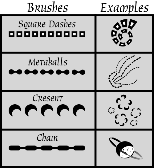 This is a table with four columns, each containing different types of brushes. In the first column, there are three examples of square dashes. The second column has three examples of metallic balls. The third column features three examples of cream. Finally, the fourth column displays three examples of chain. Each example is accompanied by a corresponding icon or symbol to represent the type of brush.
