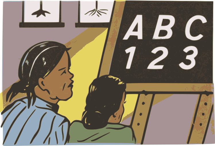 This depicts two women sitting in front of a chalkboard, attentively watching as the teacher writes on it. They are learning letters and numbers, possibly in an Indonesian language class. One woman is positioned to the left of the other, both with black hair. The scene appears to be set in a classroom or educational setting where students are actively engaged in their lessons.