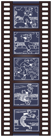 This features a strip of photographic film with four different images on it. Each image is unique and captures various scenes, showcasing the versatility of the film. One of the images depicts a person holding a baseball bat, while another shows a man playing tennis. A third scene displays a person riding a bicycle, and finally, there's an image of a person standing in front of a bench. The combination of these diverse scenes on the same film strip highlights its potential for capturing various moments and interests.