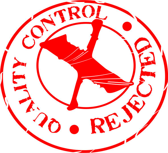 This features a red circle with white text that reads "Quality Control Rejected." Inside the circle, there is an illustration of a broken umbrella. This design gives the impression of a sticker or seal indicating that the item has been rejected for quality control purposes. The overall appearance suggests that this could be used as a label to indicate items that have failed inspection or are not up to certain standards.