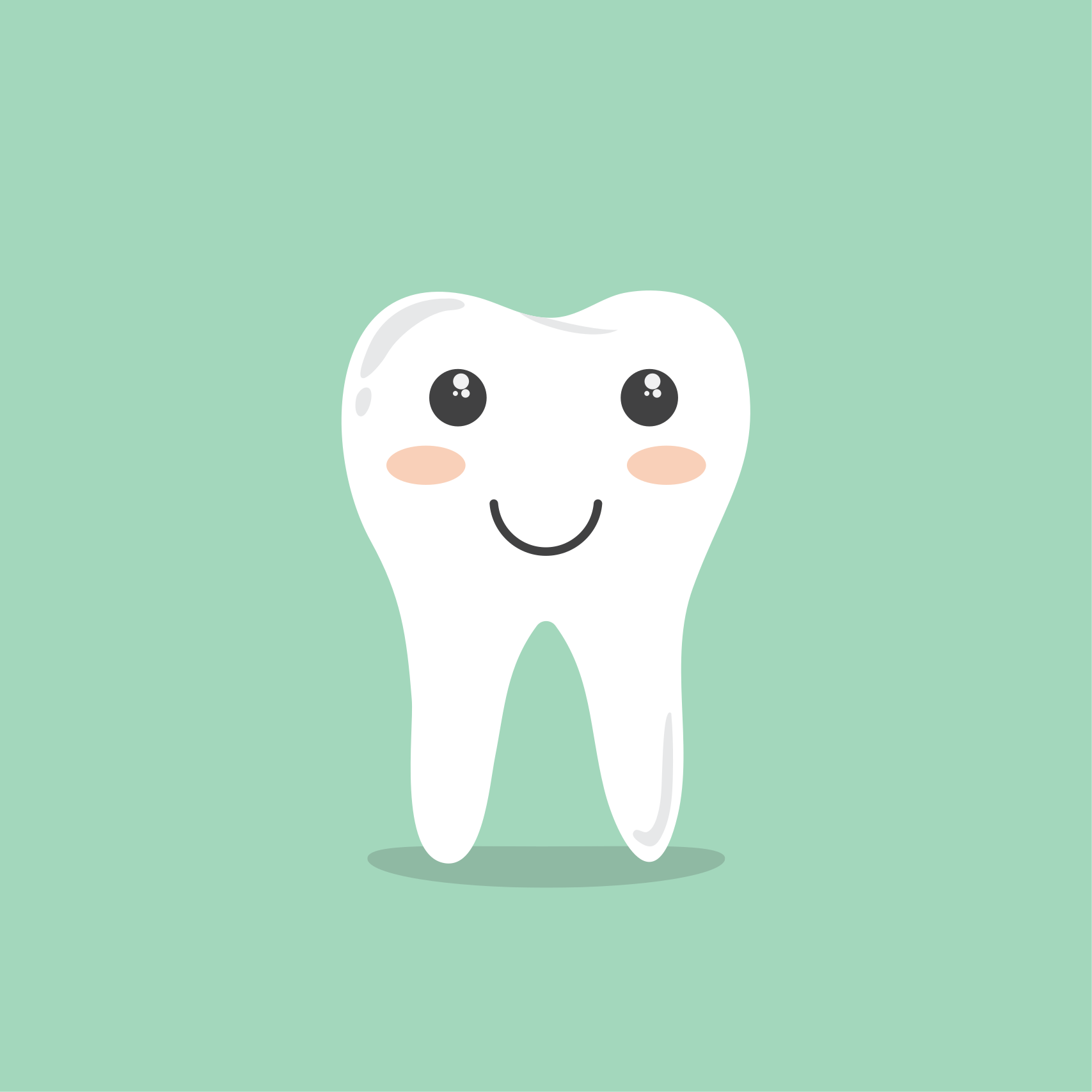 This features a cartoon tooth with a smile on its face. It has two rosy cheeks and a shadow underneath it, giving the impression of a smiling mouth. The background is mint green, which adds a fresh and vibrant touch to the scene. This whimsical representation of a tooth can be used in various contexts such as dental advertisements or educational materials for children.