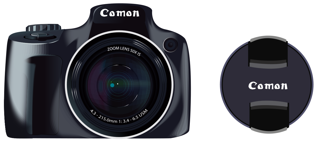 This features a black digital camera with a lens cap on the right side. The camera is made by the brand "Common," and it has a large lens that captures high-quality images. The lens cap protects the lens when not in use, ensuring optimal performance. This type of camera is ideal for photographers who want to capture stunning photos with ease.