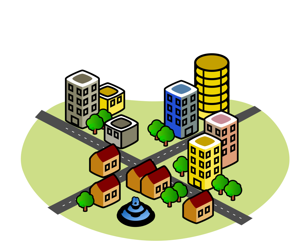 This features a cartoon cityscape with various buildings and streets. There are several tall buildings, including one that is yellow in color. A large number of trees can be seen throughout the scene, adding to the overall charm of the city. In addition to the buildings and trees, there are multiple cars scattered around the area, indicating a busy urban environment. The cartoon style of the image gives it a playful and whimsical appearance.