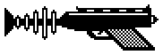 This features a black and white gun, which is the main focus of the picture. It appears to be an old-school style clip art, possibly from Mixipix by Beagle Bros. Minipix was a three part clip-art collection for the Apple II version of the original Print Shop. The gun has a distinctive design and seems to be the central element in this particular image.