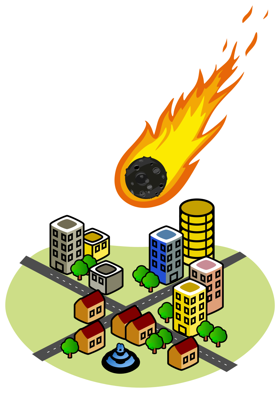 Tags: emergency, disaster, asteroid, impact, space, fireball, fire, city, tree, fountain, road, house, cartoon, cityscape, rocket