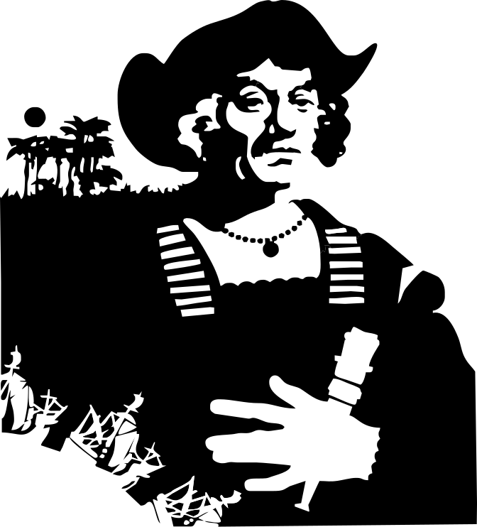 This features a black and white silhouette of Christopher Columbus, the famous explorer who led the first European expedition to the Caribbean, Central America, and South America. He is depicted wearing a ruffled collar and holding an object in his hand. The scene also includes several palm trees scattered around the background, adding to the overall atmosphere of the image. Columbus's legacy has been both celebrated and criticized for his role in the colonization of the Americas, which led to significant changes in the indigenous populations and their way of life.