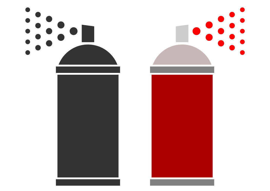 This features two red and black canisters, one on the left side of the frame and another on the right. They are both filled with a red substance, which appears to be paint or spray. The canisters have a similar design, giving them an identical appearance. The red color is prominent in both objects, making them stand out against their black background.