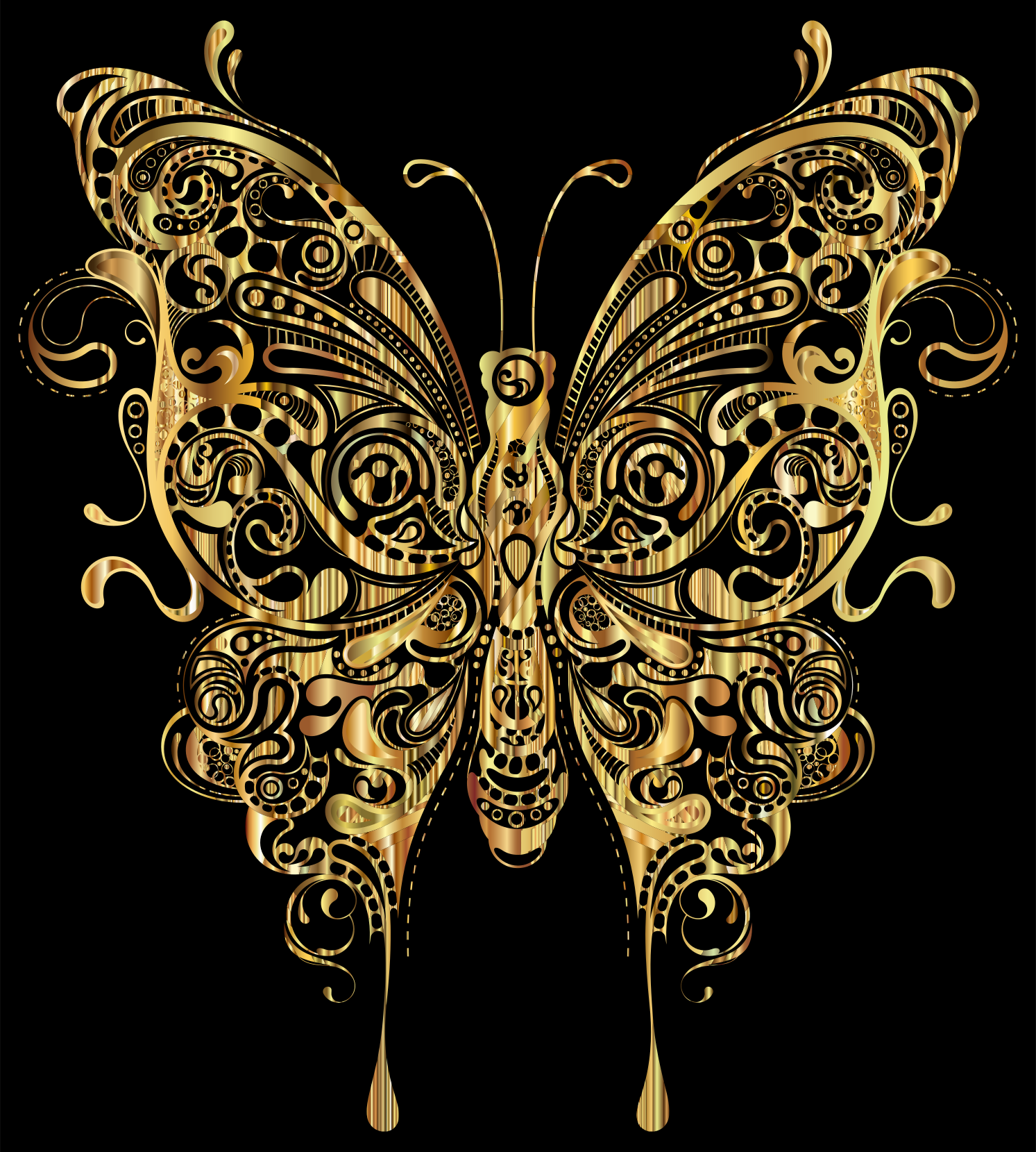 This features a beautifully designed butterfly with an intricate and ornate pattern. It is adorned in gold, giving it a luxurious appearance. The butterfly's wings are spread out, showcasing its unique design. The background of the image is black, which allows the butterfly to stand out prominently. This artistic representation of a butterfly can be appreciated for its craftsmanship and attention to detail.