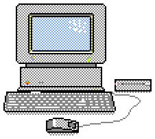 This features a computer monitor with a keyboard and mouse placed in front of it. The monitor is turned on, displaying a blue screen with white text. The keyboard is positioned to the left of the monitor, while the mouse is located slightly below the center of the keyboard. This scene appears to be an illustration or drawing of a computer setup, possibly from the 1980s era when Beagle Bros was active.