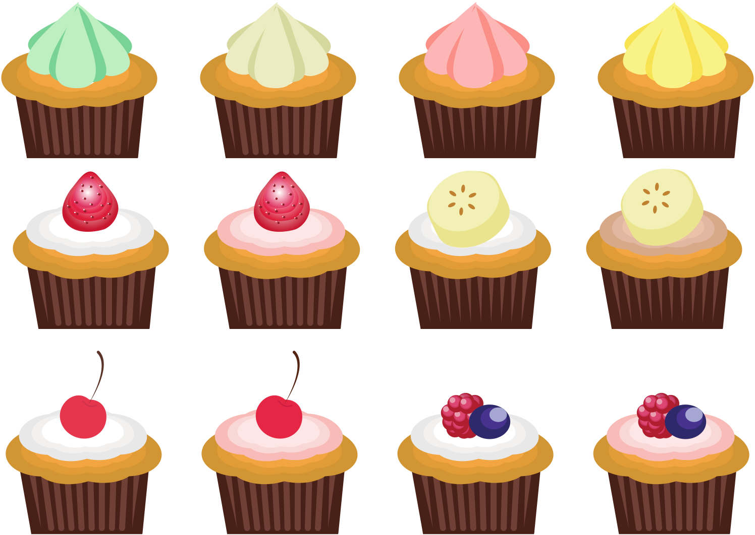 This features a delightful collection of six different cupcakes, each with unique toppings. These cupcakes are presented in an appealing manner, showcasing their various flavors and decorations. They are arranged in a row on the left side of the image, with each cupcake occupying a distinct space. The assortment includes a mix of fruits such as strawberries, raspberries, blueberries, and cherries, adding to their visual appeal and making them look even more tempting.