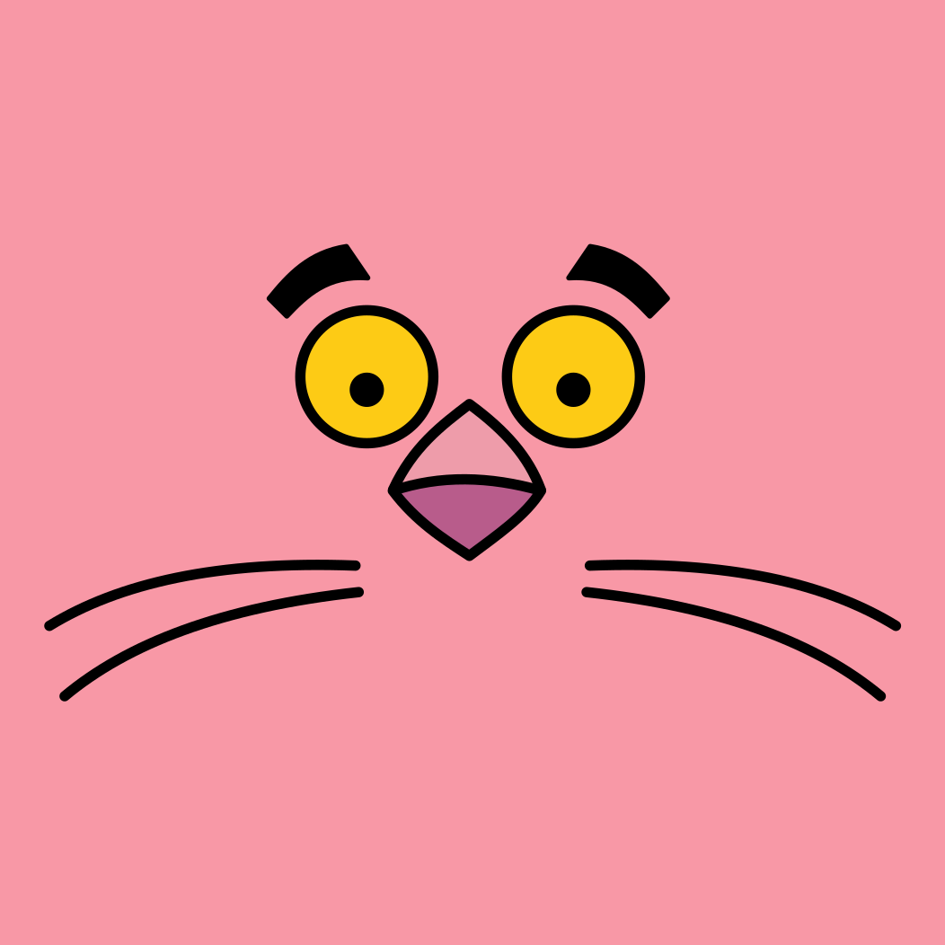 This features a cartoon character, the Pink Panther, with an exaggerated and comical expression. The character's face is large and takes up most of the frame, giving it a prominent appearance. The eyes are wide open, making them appear to be staring directly at the viewer. The nose is slightly turned upwards, adding to the character's quirky demeanor. The mouth is closed, but its shape suggests that it might be smiling or frowning in a playful manner. Overall, this illustration captures the essence of the Pink Panther and showcases its unique personality.
