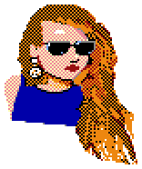 This features a retro 8-bit bitmap style graphic of a woman with long red hair, wearing sunglasses. She is dressed in a blue outfit and appears to be looking at the camera. The overall design gives off an old-school vibe reminiscent of the Beagle Bros Clip Art from the Apple IIGS era. This style of artwork was popular during the 1980s, and it has been preserved in this particular image.