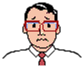 This features a man wearing glasses and a red tie, giving him a professional appearance. He is looking downward with an expression of concern or sadness on his face. The man's attire includes a white shirt and the tie is placed around his neck. The overall style of the image can be described as retro, possibly reminiscent of a 1980s clip art design from Beagle Bros.
