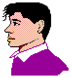 This is a retro 8-bit bitmap style graphic of a man's head. He has short hair and appears to be wearing a purple shirt with white trim. His eyes are open, giving the impression that he is looking directly at the viewer. The overall design of the image gives it an old-fashioned feel, reminiscent of classic video game characters or pixel art from the 1980s and 1990s.