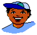 This is a retro 8-bit bitmap style graphic of a boy wearing a baseball cap. He has a big smile on his face and appears to be happy. The image is in color, with the boy's face being the main focus. The background features a checkered pattern that adds to the nostalgic feel of the image. This could be an illustration from the Beagle Bros Clip Art for the Apple IIGS.